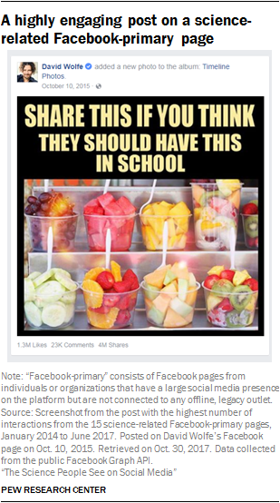 Among the science-related Facebook-primary pages, 12 of the top 15 most engaging posts were produced by David Wolfe, an author and product spokesman who emphasizes alternative remedies and promotes the health benefits of raw foods.14 Half of these 12 popular posts from David Wolfe featured inspirational sayings or advice, such as an April 2015 post which encouraged readers to “look after your friends.”