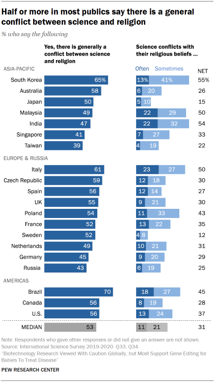 Asked to report how often their personal religious beliefs conflict with science, a median of just one-in-ten say there is often conflict. A median of 31% across the 20 publics surveyed say such conflict occurs at least sometimes. Majorities across most of these publics say there is rarely or never conflict between the two.