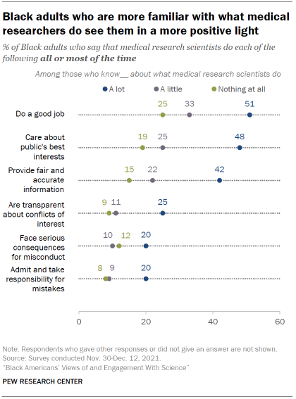 The share of Black adults who are most familiar with medical researchers are markedly more trusting of them to do a good job, care about people’s best interests and provide fair and accurate information about their research findings. For example, 51% of this group says that medical research scientists do a good job conducting research all or most of the time.