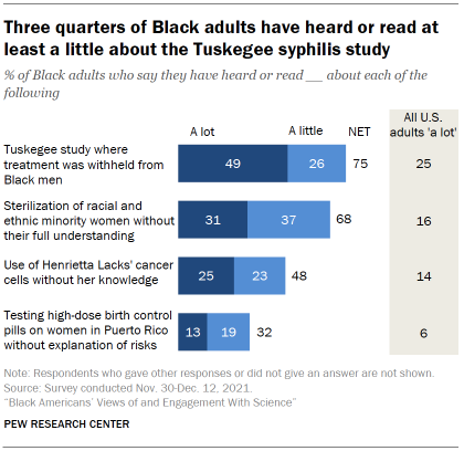 Still, there are ongoing concerns about the potential for research misconduct and accountability. Most Black Americans are familiar with the legacy of past research abuses. Three-quarters of Black Americans know at least a little about the Tuskegee syphilis study, a study conducted by the federal government in which treatment was withheld from Black men.