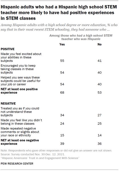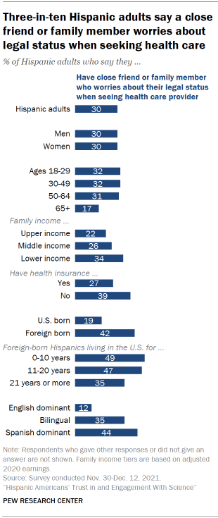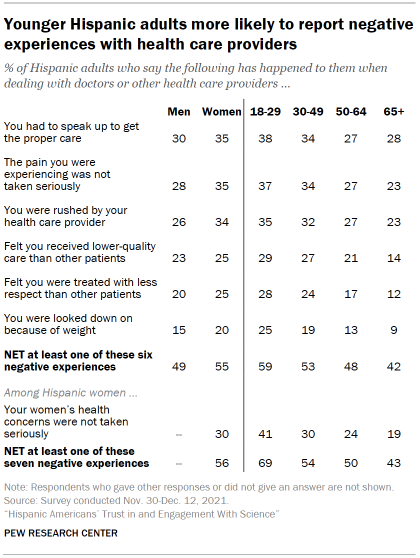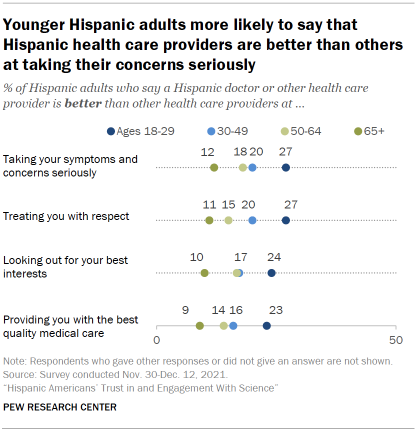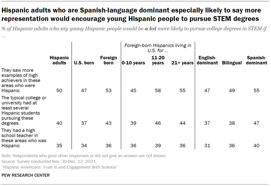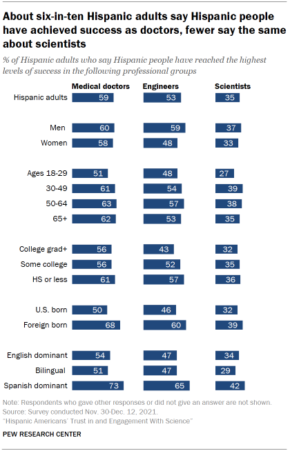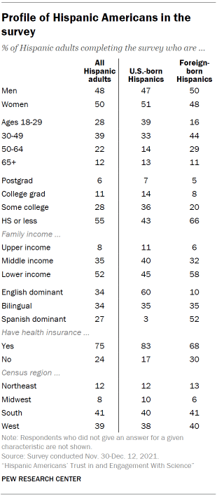 Report | June 14, 2022 Hispanic Americans’ Trust in and Engagement With Science Appendix: Detailed charts and tables X Facebook Threads LinkedIn WhatsApp Mail Print Add Us On Google By Cary Funk and Mark Hugo Lopez Table of Contents Hispanic Americans’ Trust in and Engagement With Science 1. A brief statistical portrait of U.S. Hispanics 2. Hispanic Americans’ experiences with health care 3. Hispanic Americans’ trust in medical scientists and views about the potential for researcher misconduct 4. High engagement with COVID-19 news among Hispanic adults 5. Many Hispanic Americans see more representation, visibility as helpful for increasing diversity in science Acknowledgments Methodology Appendix: Detailed charts and tables ← Prev Page 1 … 4 5 6 7 8 9 Next Page → Report PDFToplineAmerican Trends Panel Wave 100