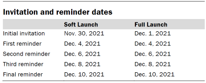 Invitations were sent out in two separate launches: soft launch and full launch. Sixty ATP panelists and 526 KP panelists were included in the soft launch, which began with an initial invitation sent on Nov. 30, 2021. The ATP panelists chosen for the initial soft launch were known responders who had completed previous ATP surveys within one day of receiving their invitation. All remaining English- and Spanish-speaking panelists were included in the full launch and were sent an invitation on Dec. 1, 2021.