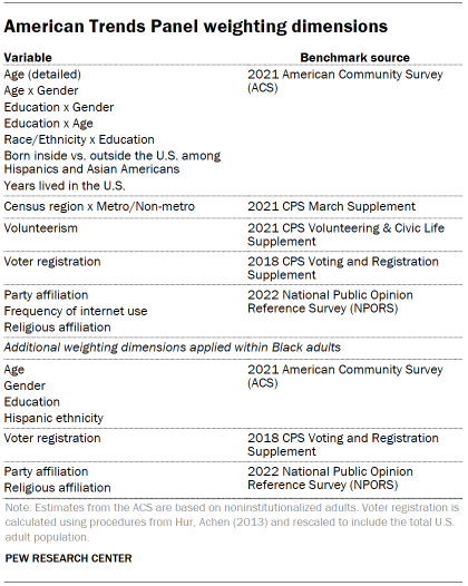 Finally, the weights are calibrated to align with the population benchmarks in the accompanying table to correct for nonresponse to recruitment surveys and panel attrition. If only a subsample of panelists was invited to participate in the wave, this weight is adjusted to account for any differential probabilities of selection.