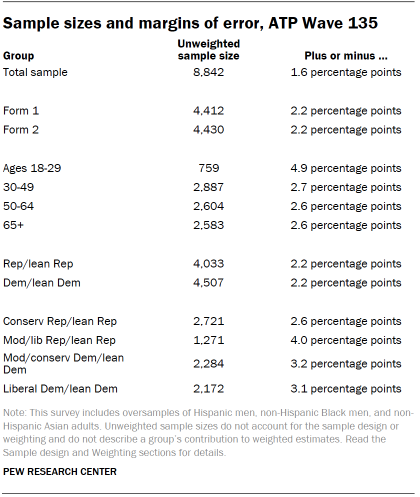Sample sizes and sampling errors for other subgroups are available upon request. In addition to sampling error, one should bear in mind that question wording and practical difficulties in conducting surveys can introduce error or bias into the findings of opinion polls.