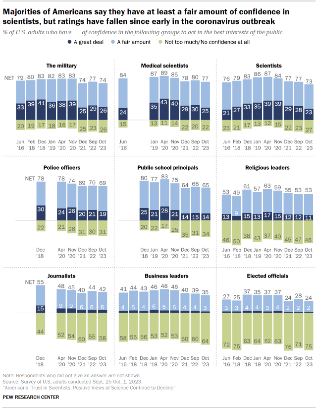 Roughly three-quarters of Americans say they have a great deal or a fair amount of confidence in medical scientists (77%), the military (74%) and scientists (73%) to act in the public’s best interests. These three groups receive the highest ratings of the nine included in the survey. About a quarter say they have a great deal of confidence in each to act in the public’s best interests.