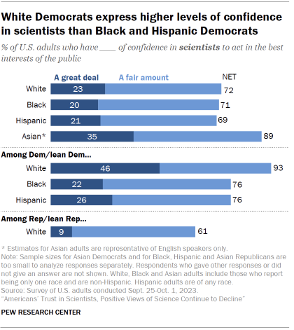 Among Democrats, however, larger shares of White Democrats (46%) than Hispanic (26%) and Black Democrats (22%) say they have a great deal of confidence in scientists. (Sample size for Asian Democrats is too small to analyze responses separately.)