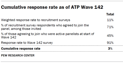To ensure high-quality data, the Center’s researchers performed data quality checks to identify any respondents showing clear patterns of satisficing. This includes checking for whether respondents left questions blank at very high rates or always selected the first or last answer presented. As a result of this checking, two ATP respondents were removed from the survey dataset prior to weighting and analysis.