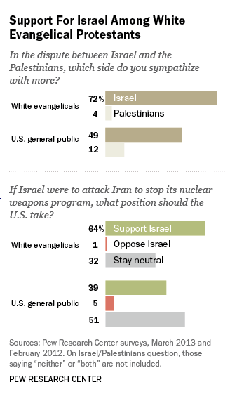 When it comes to the long-standing conflict between Israel and the Palestinians, asked whether they sympathize with either side, 72% of white evangelicals sided with Israel in the dispute while 4% picked the Palestinians, according to a March 2013 survey. Among U.S. adults overall, 49% sympathized more with Israel and 12% with the Palestinians. Half (50%) of white evangelicals said there is no way for Israel and an independent Palestinian state to coexist peacefully, a view held by just a third (33%) of U.S. Jews and 41% of the general public.
