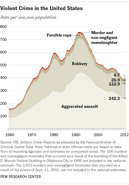 As of 2012, the most recent year available, the overall violent-crime rate had fallen to 386.9 reported crimes per 100,000, the lowest rate in more than four decades. Murder, the crime that most commonly carries the death penalty (and which all people currently on death row were convicted of), was down to 4.7 per 100,000, about where it was in the early 1960s.