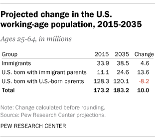 That numerical loss will be partially offset by an increase in the number of working-age U.S.-born adults with immigrant parents, who are projected to number 24.6 million in 2035, up from 11.1 million in 2015.