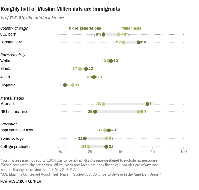 While U.S. Muslims overall are largely an immigrant population (58%), Muslim Millennials are somewhat less likely to have been born abroad than are older Muslim adults (52% versus 64%), according to a 2017 Pew Research Center survey. (Within the general public, 15% of all Millennials are immigrants.) Racially and ethnically, 40% of Muslim Millennials identify as white (including Arabs and people of Middle Eastern ancestry), 29% as Asian (including people of Pakistani or Indian descent), 17% as black and 11% as Hispanic. Muslim Millennials are less likely to be married than are older Muslim adults (36% versus 71%), though they are roughly as likely to be married as Millennials in the general public (30%). And although Muslim Millennials are less likely than older Muslim adults to have at least a bachelor’s degree (24% versus 38%), they are about as likely to have one as Millennials in the general public (27%).