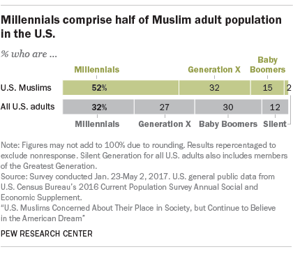 The Muslim population in the United States is younger than the U.S. population at large. In fact, while Millennials make up 32% of all U.S. adults, they account for roughly half of American Muslim adults (52%).