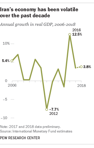 Iran is not only the world’s fifth-biggest petroleum producer (about 4.1 million barrels a day) and 12th-biggest exporter (1.3 million barrels a day), it also has the world’s fourth-largest stock of proven crude oil reserves: 158.4 billion barrels, trailing only Venezuela, Saudi Arabia and Canada. Despite its oil wealth, Iran’s economy has been turbulent for much of the past decade. It’s real (inflation-adjusted) gross domestic product fell in three of the four years from 2012 to 2015, grew by 12.5% in 2016 and is projected to have fallen back dramatically since then.