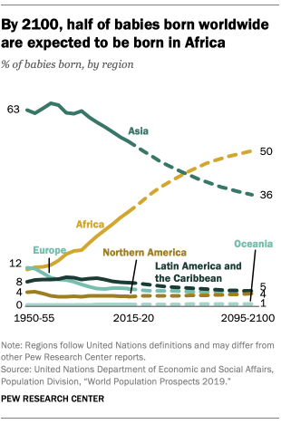 Africa is projected to overtake Asia in births by 2060. Half of babies born worldwide are expected to be born in Africa by 2100, up from three-in-ten today. Nigeria is expected to have 864 million births between 2020 and 2100, the most of any African country. The number of births in Nigeria is projected to exceed those in China by 2070.