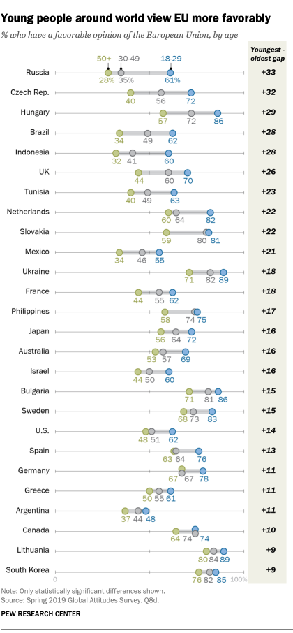 Young people around the globe have more positive views of the EU. In 26 of 33 surveyed nations, those ages 18 to 29 have more favorable attitudes toward the EU than those ages 50 and older, including in 15 countries that are not EU members. Outside of Europe, these age differences are especially stark in countries like Brazil and Indonesia, where younger adults are 28 percentage points more likely than older adults to see the EU favorably.
