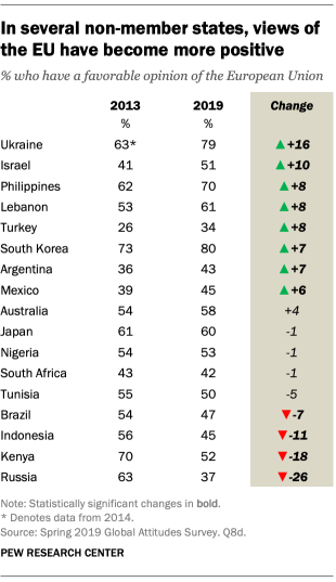 In many countries outside the European Union, views of the EU have become more favorable in recent years. The share of people with a positive view has significantly increased since 2013 in Ukraine, Israel, the Philippines, Lebanon, Turkey, South Korea, Argentina and Mexico. (The difference in Ukraine may be, in part, a result of changes in sampling after the Russian invasion of eastern Ukraine. For example, Crimea was surveyed in 2014, but was omitted from sampling in 2019 due to security concerns.)