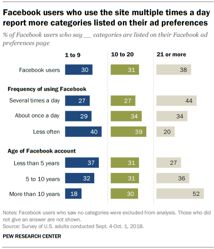 Frequent Facebook use – as well as having an account for a longer period of time – generally results in more ad categories. Nearly four-in-ten Facebook users (37%) who saw categories listed on their ad preferences page found 21 or more categories, whereas 30% found one to nine categories. When accounting for how often they use the site, some 44% of Facebook users who said they use the site several times a day reported finding 21 or more categories listed on the ad preferences page, compared with 34% of those who use the site once a day and 20% of those who said they use the site less often.