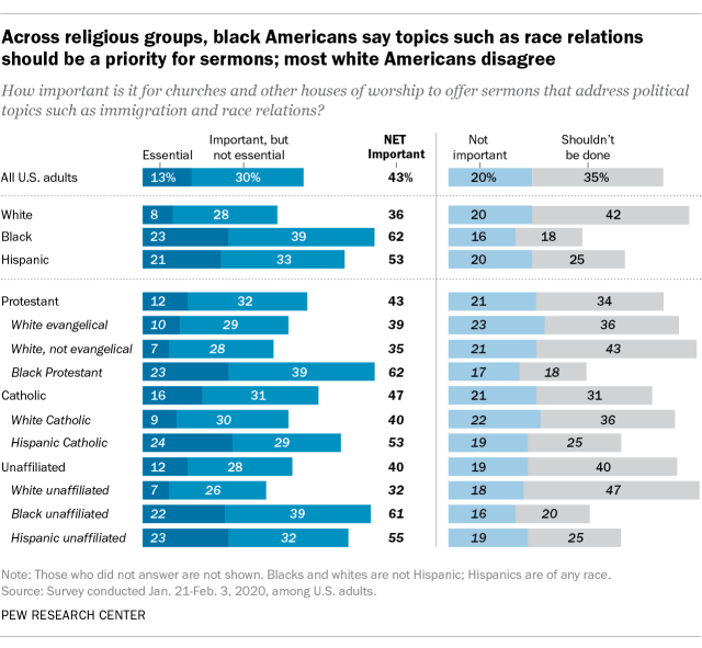 Given that tradition, black Americans and white Americans have differing views on the role that political topics such as race relations and criminal justice reform should play in religious sermons, according to a Pew Research Center survey conducted earlier this year, before the killing of George Floyd and the ensuing protests.