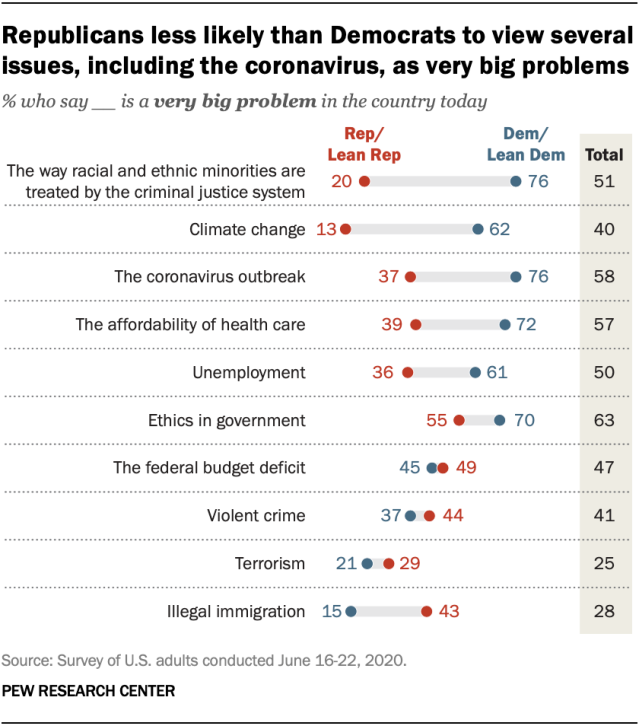 Democrats are generally far more likely than Republicans to view several concerns – including how racial and ethnic minorities are treated by the criminal justice system, the coronavirus outbreak and unemployment – as very big problems in the country, according to a Pew Research Center survey conducted June 16 to 22 (before the most recent spike in coronavirus cases in several states).