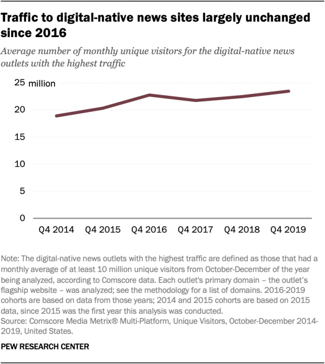 - Traffic to digital-native news sites has plateaued in recent years. After rising from 2014 to 2016, it remained steady through 2019. The average monthly number of fourth-quarter unique visitors for the primary domains of these outlets in 2019 was 23.5 million, up only 3% from 2016, when it was 22.8 million. (The digital-native news outlets included in this analysis are those whose primary domain – the outlet’s flagship website – averaged at least 10 million unique visitors per month from October to December of each year analyzed, according to Comscore, a cross-platform audience measurement company. There were 46 such outlets in 2019; for a full list of outlets and collection methods, see the methodology.)