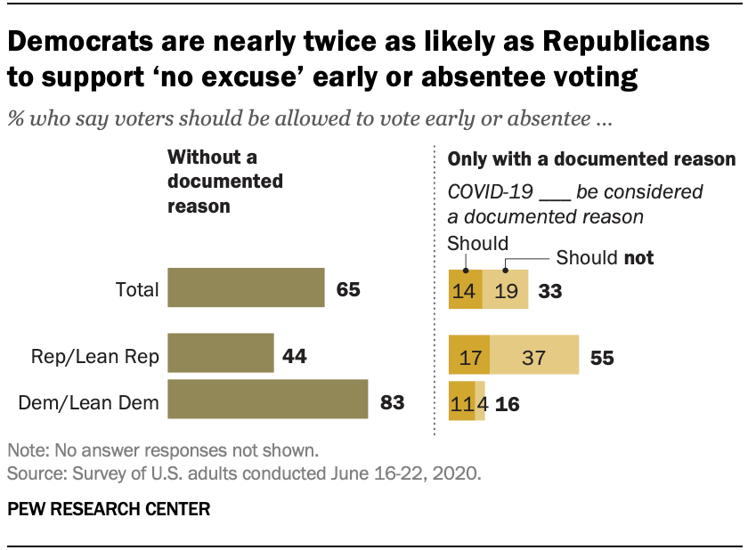 Democrats and Democratic-leaning independents overwhelmingly support so-called “no excuse” early or absentee voting: 83% say this. Among the small share of Democrats who do not, most say the coronavirus outbreak should qualify as a documented reason.