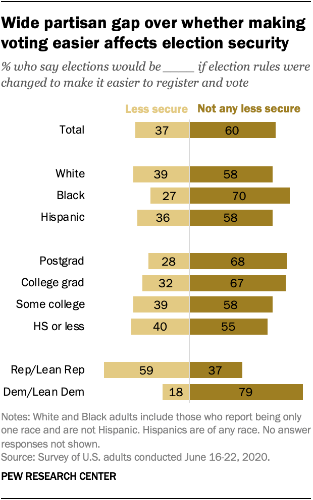 However, there is a stark partisan divide in these views: Nearly eight-in-ten Democrats (79%) say that changes to election rules to make it easier to register and vote would not make elections any less secure, while 59% of Republicans say they would.