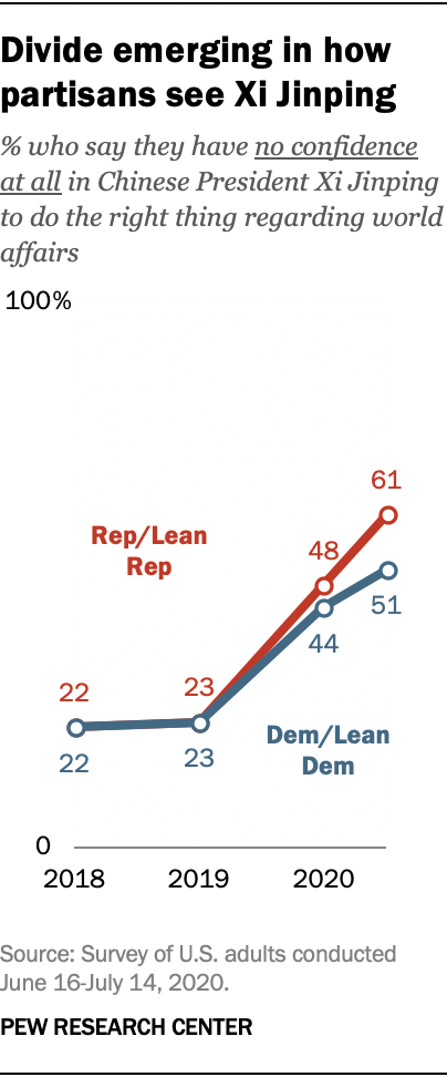 Americans have little confidence in Chinese President Xi Jinping, but Republicans are especially critical. Overall, around three-quarters of Americans (77%) have little or no confidence in President Xi to do the right thing in world affairs, including 55% who have no confidence at all in the Chinese leader. The share with no faith in Xi has increased by 10 points over the past four months and is more than double the share who said this in 2019. While Republicans and Democrats were equally likely to lack confidence in the Chinese leader in 2018 and 2019, there is a now a partisan gap: Republicans are more likely than Democrats to say they have little or no faith in Xi (82% vs. 75%). Republicans are also more likely to say they have no confidence at all in Xi (61% vs. 51%).
