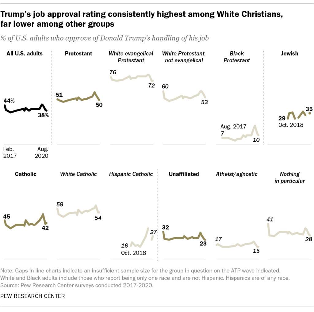 Trump has consistently received his lowest approval ratings from Black Protestants, Hispanic Catholics, Jews and religiously unaffiliated voters.