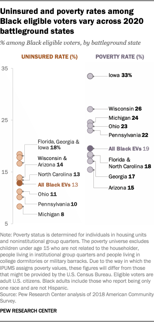Uninsured and poverty rates among Black eligible voters vary across 2020 battleground states