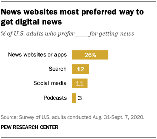 Among digital platforms, the most preferred one for news is news websites or apps: About a quarter of U.S. adults (26%) prefer to get their news this way, compared with 12% who prefer search, 11% who prefer to get their news on social media and 3% who say they prefer podcasts.