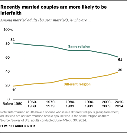 Interfaith marriage: Harris and Emhoff are among a growing share of married adults whose spouse does not share their religion. Harris is Christian and attends a Baptist church, and Emhoff is Jewish. While most married adults in the U.S. have a spouse who is the same religion as them, that has become less common in recent decades. Among adults who were married before 1960 (and are still married), only 19% have a spouse who does not share their religion. For those married in the 1980s and ’90s, 30% are in an interfaith marriage. The share has continued to rise: 39% of adults who were married between 2010 and 2014 have a spouse who identifies with a different religious group than their own.