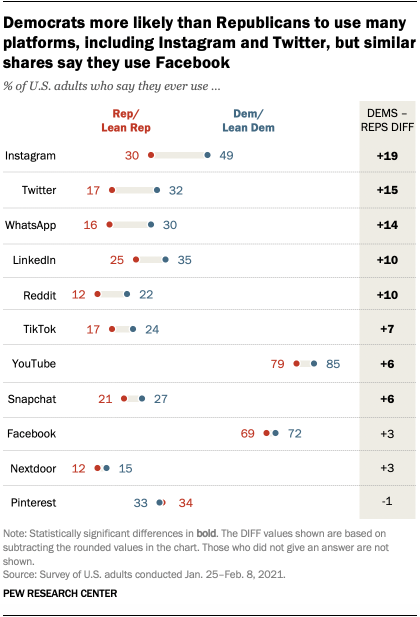 Democrats are more likely than Republicans to say they use social media overall (77% and 68%, respectively), according to a new Pew Research Center survey of U.S. adults conducted Jan. 25-Feb. 8, 2021. There are also notable differences in the shares of Democrats and Republicans who use particular platforms.