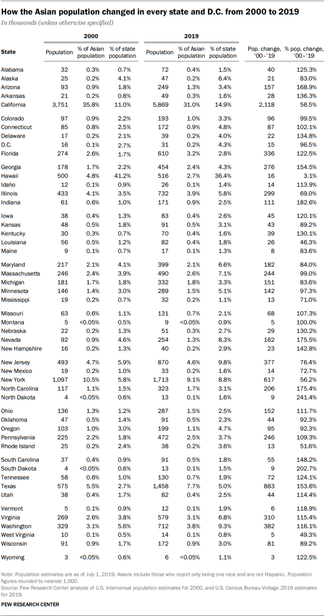 The Asian American population has increased in every state and the District of Columbia over the past two decades. California had an Asian population of roughly 5.9 million in 2019, by far the nation’s largest. It was followed by New York (1.7 million), Texas (1.5 million), New Jersey (870,000) and Illinois (732,000). A majority of U.S. Asians (56%) live in these five states.