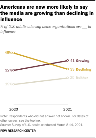 When Americans were asked to evaluate the media’s standing in the nation, about four-in-ten (41%) say news organizations are growing in their influence, somewhat higher than the one-third (33%) who say their influence is declining, according to a Pew Research Center survey conducted March 8-14, 2021. The remaining one-quarter of U.S. adults say they are neither growing nor declining in influence.