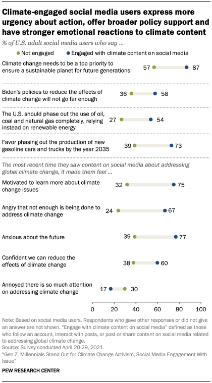 People who are engaged with the climate issue on social media – more of whom are in younger generations – are also more likely to report emotional reactions to what they see online. Among those who have recently interacted with or shared posts about the need for action on climate change, or who follow an account focused on the cause, 77% say they have felt anxiety about the future in response to climate-related content online, while 67% say they have felt anger that more is not being done to address the issue. Many in this group say they also felt motivated to learn more about climate change (75%), but a smaller majority (60%) say such content left them feeling confident about the ability to address climate change.