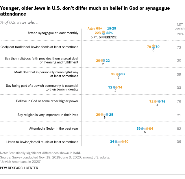 For example, Jews ages 18 to 29 are just as likely as those 65 and older to say they attend religious services at least monthly (22% each) and about as likely to say they believe in God or some other higher power (76% and 72%).