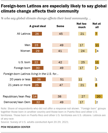 For Hispanics, climate change is not just a global, distant concern. About seven-in-ten Hispanic adults (71%) say climate change is affecting their local community at least some, a higher share than among non-Hispanic adults (54%), the April survey of U.S. adults found.