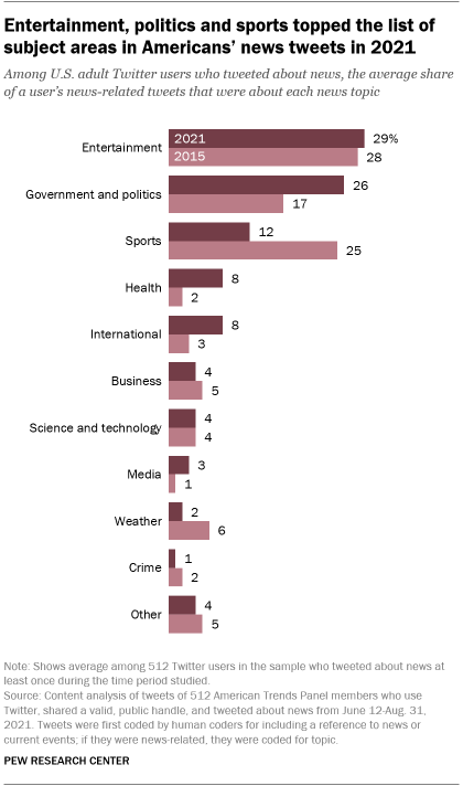 The average U.S. adult Twitter user focused on entertainment in 29% of their news-related tweets in 2021, which was roughly the same share as in 2015 (28%). But a much larger share of their news tweets focused on government and politics in 2021 than in 2015 (an average of 26%, up from 17%).