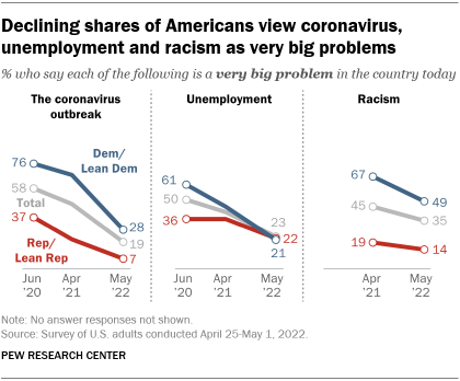 While the coronavirus has receded as a major problem over the past two years, so too has unemployment. In the new survey, just 23% of Americans rate unemployment as a very big problem, down from 41% a year ago and 50% in June 2020. The decline has come among members of both parties.