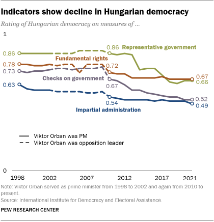 Indicators from the International Institute for Democracy and Electoral Assistance show a significant backslide in democracy in Hungary since 1998, when Orban took office for the first time as prime minister. The sharpest decline in these indicators – which measure representative government, fundamental rights, checks on government power and impartial administration – appear after 2010, when Orban began his second stint as prime minister. In Europe and globally, these same measures have, on average, remained largely stable in the same period.