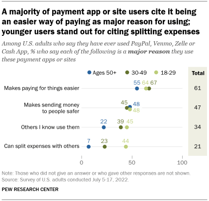 When asked what motivates them to use these sites or apps, users most frequently point to ease. Roughly six-in-ten Americans who have ever used PayPal, Venmo, Zelle or Cash App (61%) say a major reason for doing so is because it makes paying for things easier.