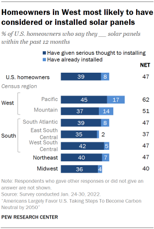 In the January survey, homeowners in Western states were especially likely to have considered or already installed solar panels at their homes, as past Center surveys have also found. Among homeowners in the Pacific region, 45% say they’ve given serious thought to installing solar panels to generate electricity for their home, while another 17% say they’ve already done this. About half of homeowners in the Mountain region (51%) also say they have either given serious thought to installing or already installed solar panels.