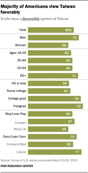 Men are more likely than women to see Taiwan favorably, as are those with more education. About three-quarters or more of Americans with a bachelor’s degree (76%) or postgraduate degree (79%) have a favorable opinion of Taiwan, compared with about six-in-ten of those who have some college education or less. (Men and those with a college degree are also more likely to offer a response to this question.)