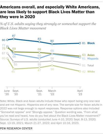 Support for Black Lives Matter has decreased significantly among U.S. adults since June 2020, the same Center survey shows. Two-thirds of adults strongly or somewhat supported the movement in June 2020 – shortly after Floyd was murdered – but that share fell to 56% in March 2022 and 51% in April 2023.