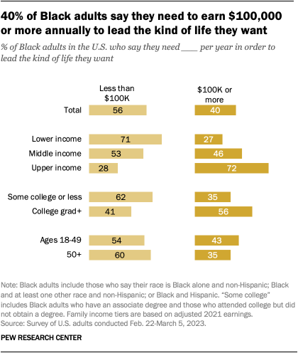 Four-in-ten Black adults in the U.S. say an annual income of $100,000 or more is enough to lead the kind of life they want. But more than half (56%) say they need less than $100,000.