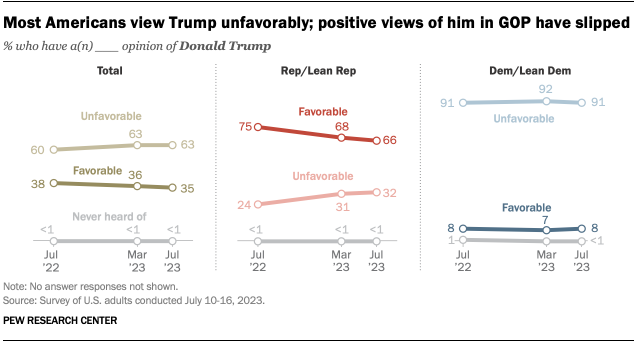 Trump remains broadly unpopular with the public: 63% of Americans have an unfavorable opinion of the former president, while 35% view him favorably. A year ago, Trump’s rating stood at 60% unfavorable.