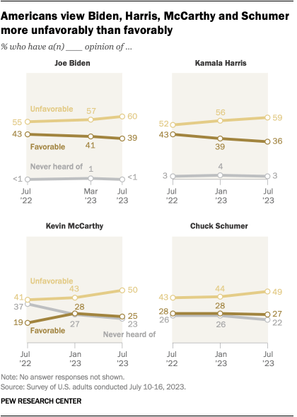 The public’s views of four other political leaders included in the survey, including President Joe Biden, also continue to be more unfavorable than favorable.