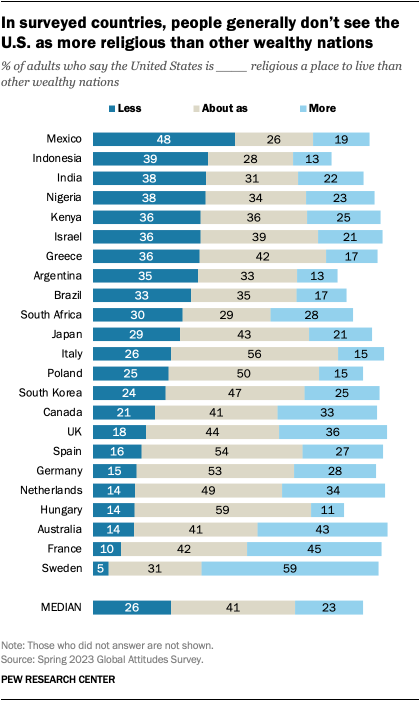 A global median of 23% of adults say the U.S. is more religious than other wealthy nations, according to a Pew Research Center survey of 23 countries conducted this spring. Far more adults in these countries say the U.S. is either about as religious as other wealthy nations (a median of 41% say this) or less religious than other wealthy nations (a median of 26% say this).