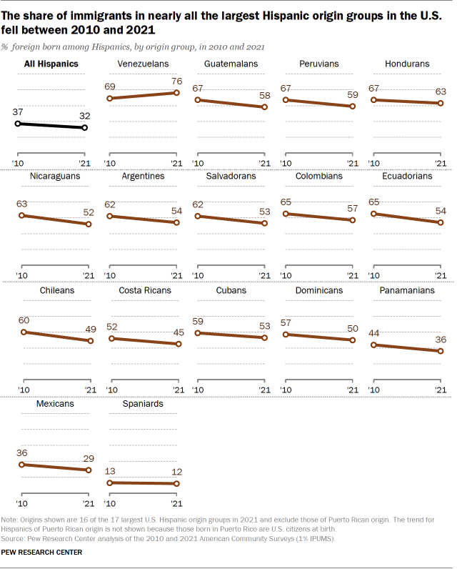 Immigrants comprised a smaller share of nearly all Hispanic origin groups in the U.S. in 2021 than they had in 2010. The sharpest decline was among Hispanics of Ecuadorian and Nicaraguan origin, by 11 percentage points each. Venezuelans were the exception: The immigrant share rose from 69% to 76%.