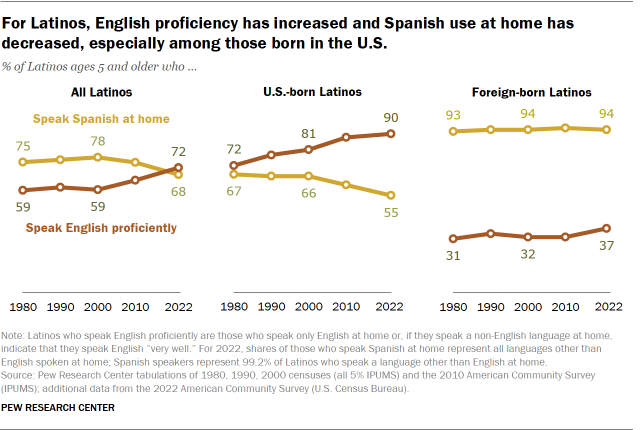 This growth has been driven by U.S.-born Latinos – that is, those born in the U.S. and its territories, including Puerto Rico, and those born abroad to American parents. Since 2000, the share of U.S.-born Latinos who speak English proficiently increased by 10 percentage points, compared with a 4-point increase among Latino immigrants. At the same time, the share of Latinos who speak Spanish at home declined from 78% in 2000 to 68% in 2024.